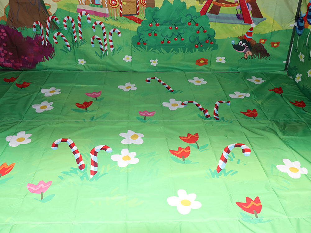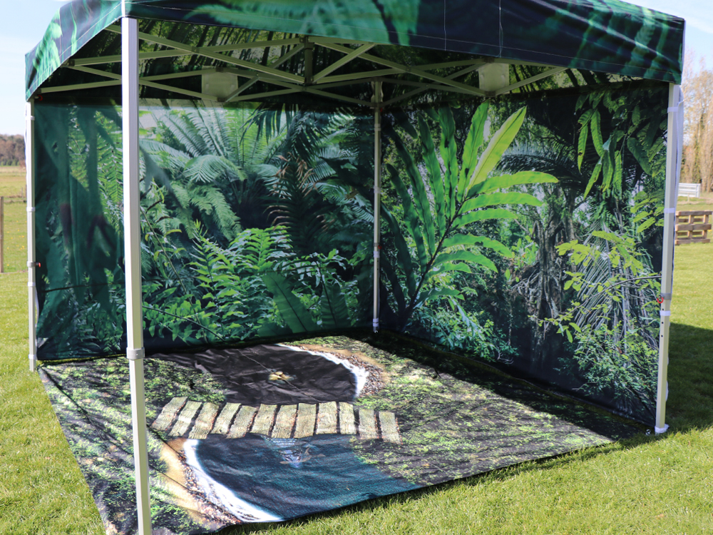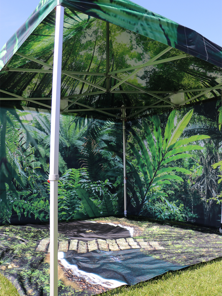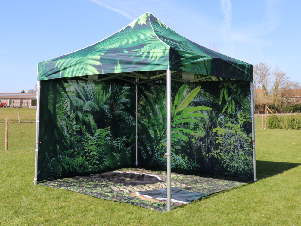 Het grondzeil is gemaakt van polyester met waterdichte PU-coating (235 g/m²) en wordt bedrukt in fullcolour sublimatie.