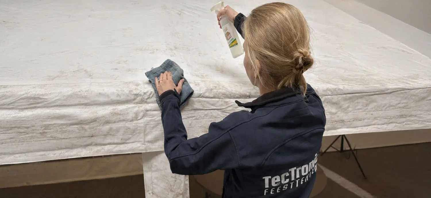- Werk in kleine zones: breng de reiniger aan op het tentzeil, laat het even intrekken zodat vuil, mos of schimmel loskomt, en schrob daarna zachtjes met een spons of borstel. Spoel de behandelde zone vervolgens grondig af met schoon water en een vochtige doek.