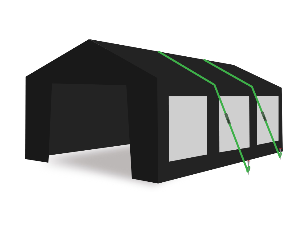 Dit frame bestaat uit buizen van gegalvaniseerd staal (Ø50 mm) die u in de koppelstukken bevestigt met behulp van bouten en moeren. Tussen de dakconstructie en de staanders plaatst u de uitbreidingsset, zodat de doorloophoogte 3 meter bedraagt. Liever een opslagtent van 4x8 met doorloophoogte van 2 meter? Ontdek dan dezelfde tent zonder uitbreidingsset.