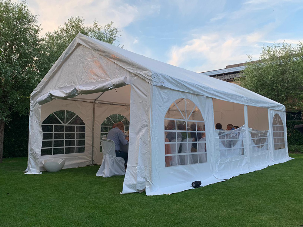 Zeer degelijke en stabiele PVC partytent van 8x4 meter voor professioneel gebruik. Het frame bestaat uit een sterk stalen 50 mm buizenframe met dubbelwandige verzinking. Dit is een partytent van duurzame kwaliteit. Ook geschikt voor langdurig gebruik (mits voldoende verankering), zelfs in de herfst of winter.