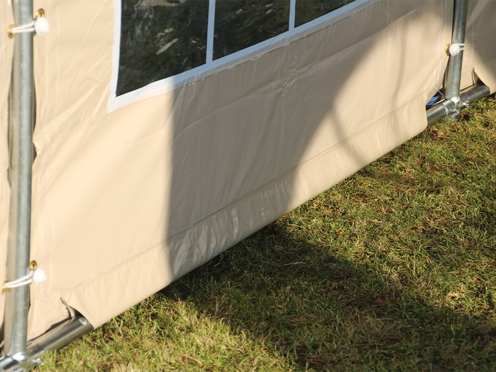 Deze feesttent 8x4 wordt compleet geleverd met alle zijpanelen. Aan de lange kant zijn de zijwanden telkens 2 meter breed en met raam. Zo kan u ook een opening maken op de 8 meter zijde van uw partytent! De korte kanten zijn blind, met aan weerszijden een deuropening met sterke ritsen. Belangrijk is dat alle zijpanelen toch winddicht kunnen afgesloten worden met sterke en brede velcroboorden. Onderaan de zijwanden zijn er sleuven om het optionele grondframe door te steken. Modderflappen rondom maken het plaatje compleet, zodat u volledig afgeschermd bent van wind en regen!