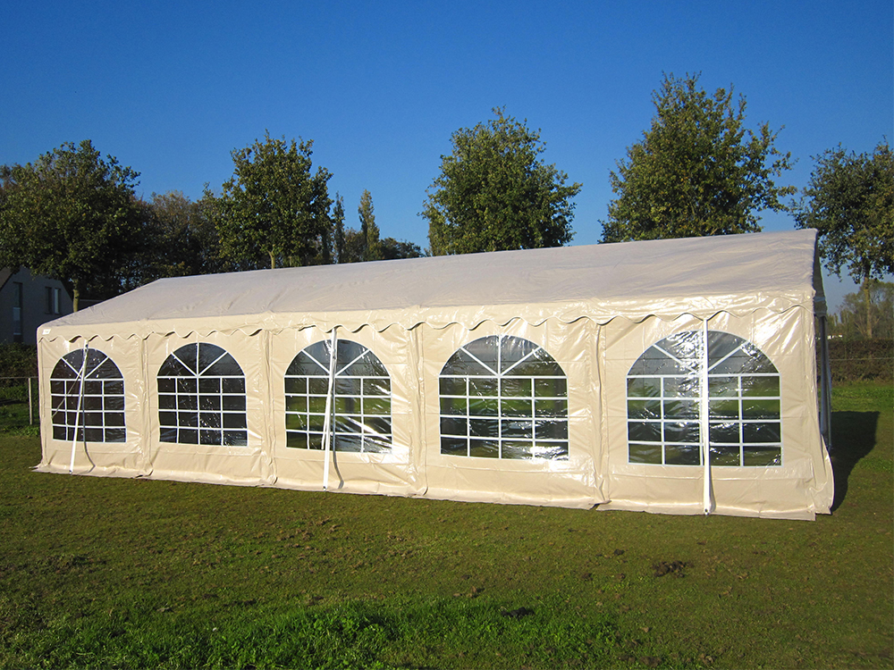 Deze partytent is beschikbaar in de kleuren wit en beige. U gaat deze tent als opslagplaats gebruiken of lange tijd buiten laten staan? Kies dan voor de versie met high quality pvc zeilen.