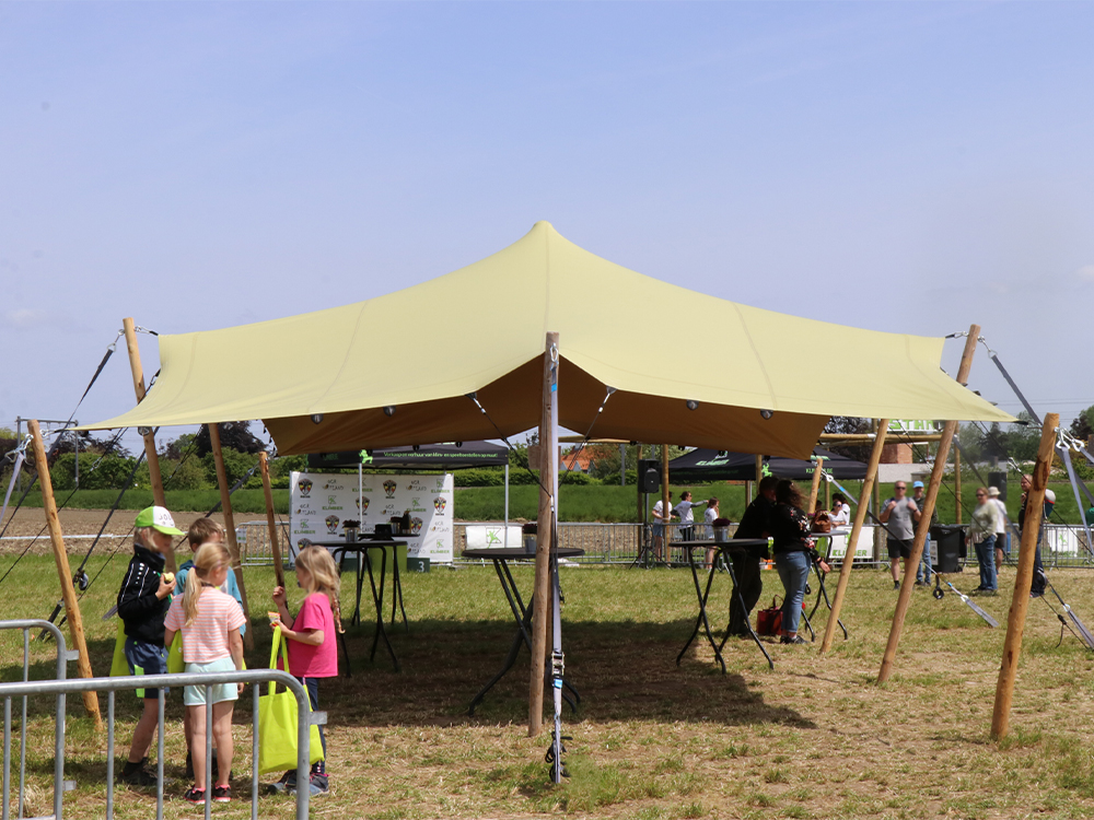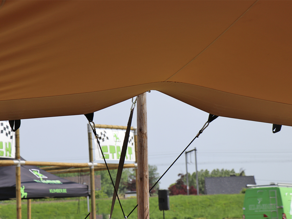 De houten palenset en al het bevestigingsmateriaal (voor zachte ondergrond) vindt u terug bij de 'Opties'. Met de heldere handleiding kan u de stretchtent gemakkelijk zelf plaatsen.