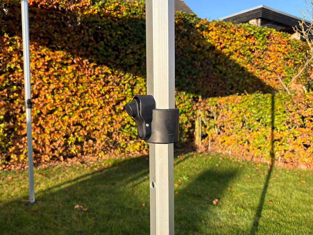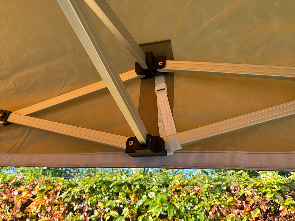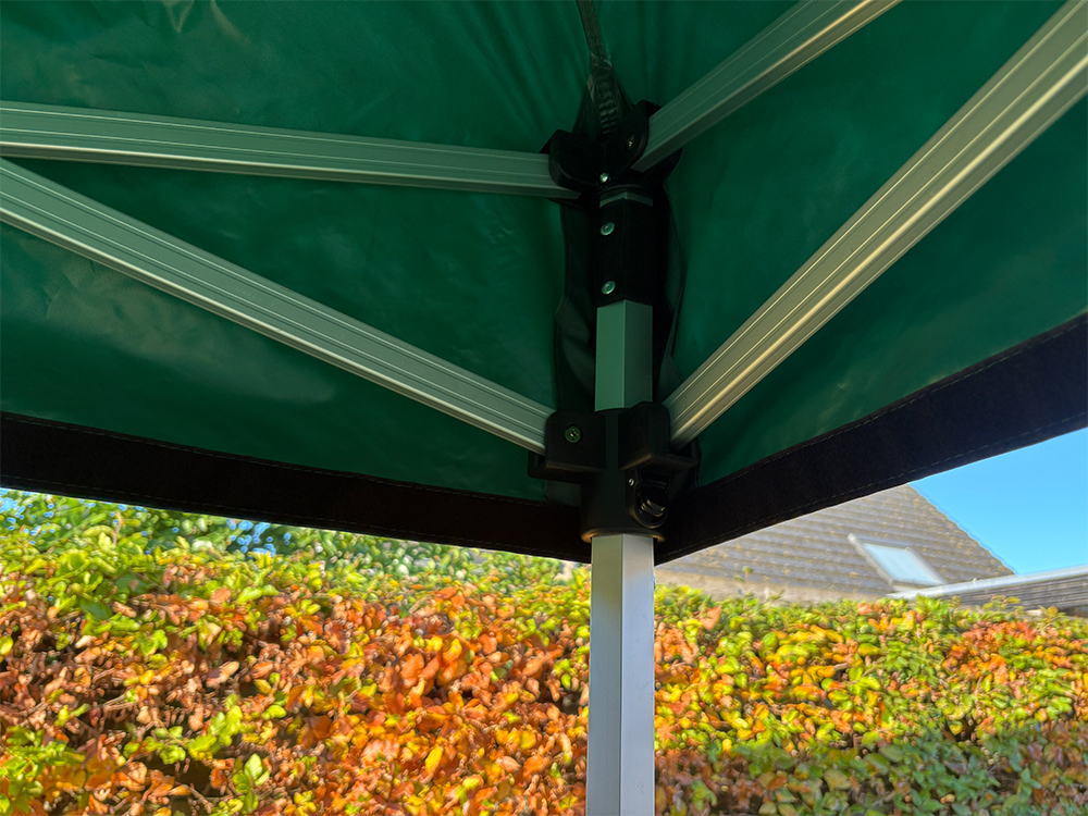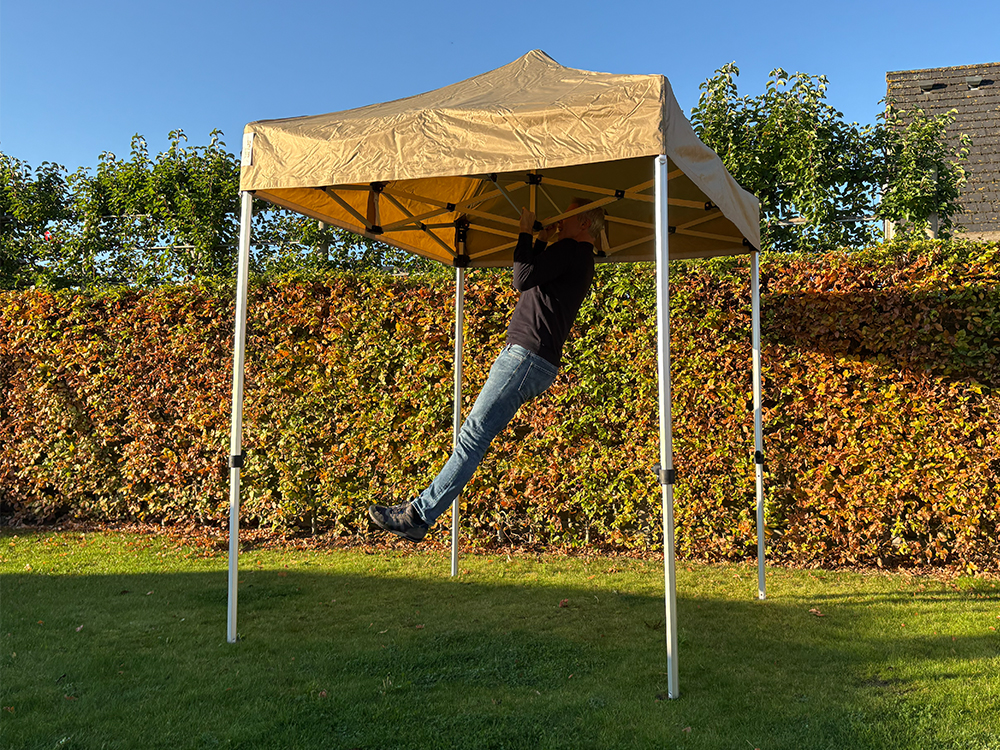 Het frame van de 2x2 vouwtent is gemaakt uit duurzaam aluminium, wat zorgt voor een ideale balans tussen stevigheid en gewicht. De zeskantige palen (Ø 40 mm) met een wanddikte van 1,4 mm maken het geheel stabiel, zelfs bij winderige omstandigheden (goede verankering vereist). Dankzij de voetplaatjes staat de tent stevig op elke ondergrond. De tent kan eenvoudig op drie hoogtes worden ingesteld dankzij de nylon koppelstukken met drukknoppen.