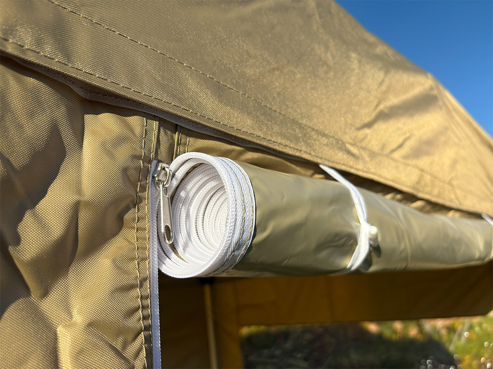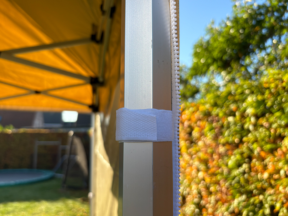 Het dakzeil bestaat uit UV-bestendig polyester met pvc-coating (300 g/m²), waardoor de tent volledig waterdicht is. De vier meegeleverde zijwanden maken de tent veelzijdig in gebruik: twee met ramen voor lichtinval, één met deur voor gemakkelijke toegang en één gesloten wand voor extra beschutting. Zo creëert u in een paar minuten een afgesloten, comfortabele ruimte.